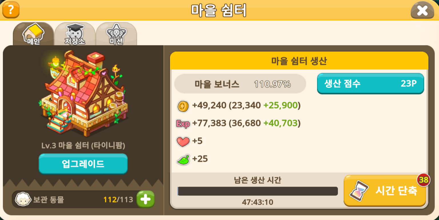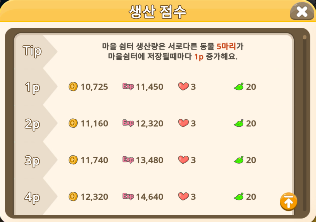마을 쉼터 생산량은 서로 다른 동물 5마리가 마을 쉼터에 저장될때마다 1P 증가합니다.