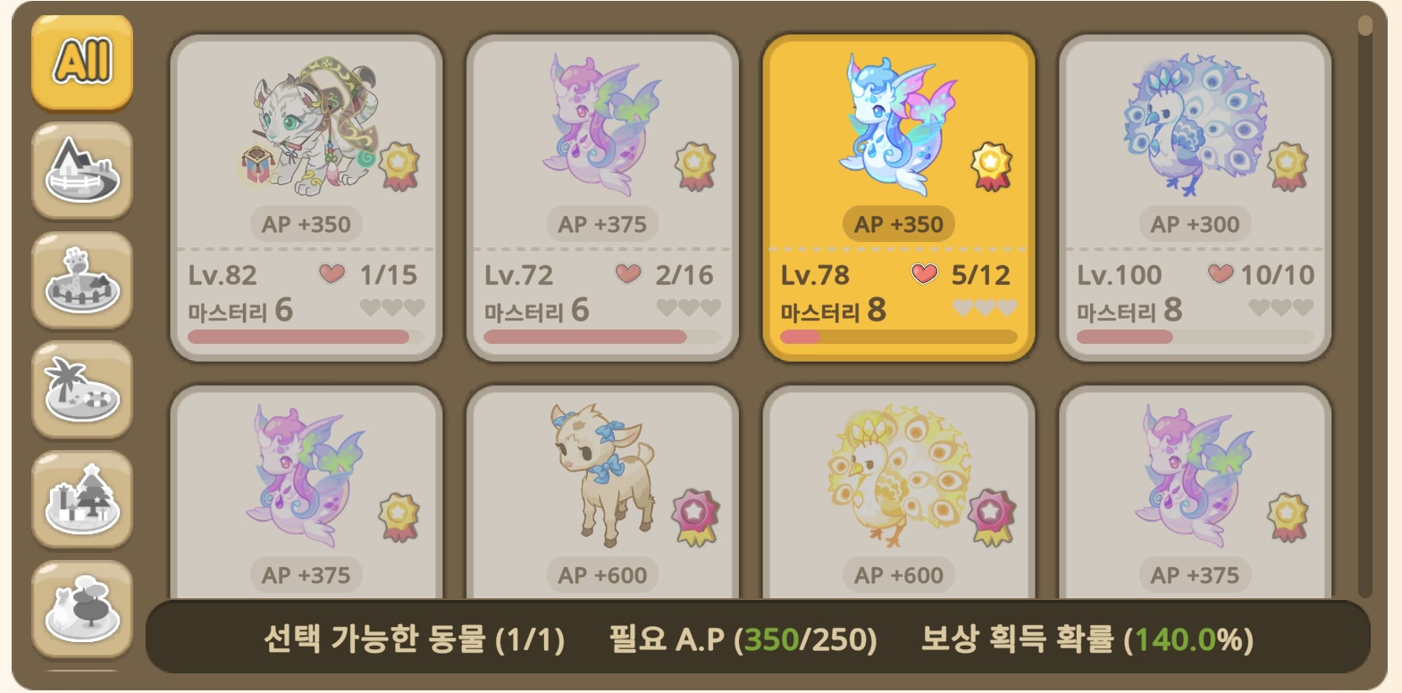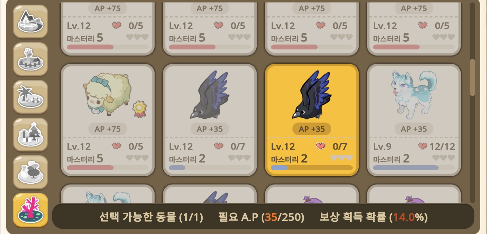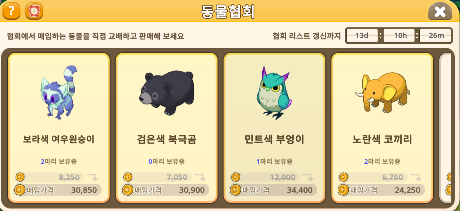 동물 협회 효율은 다 비슷하니, 마스터리작이 안되어 있는 동물 진행 후 다음 동물로 넘어가는 방법 추천