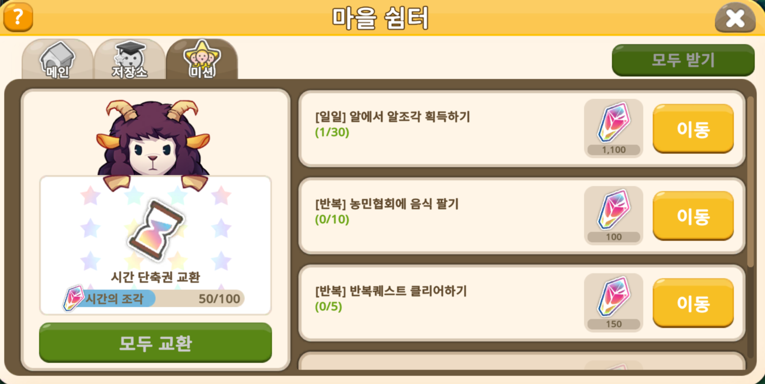 특히, 반복퀘스트 클리어하기는 시간 단축권을 반복적으로 얻을 수 있는 미션이기에,