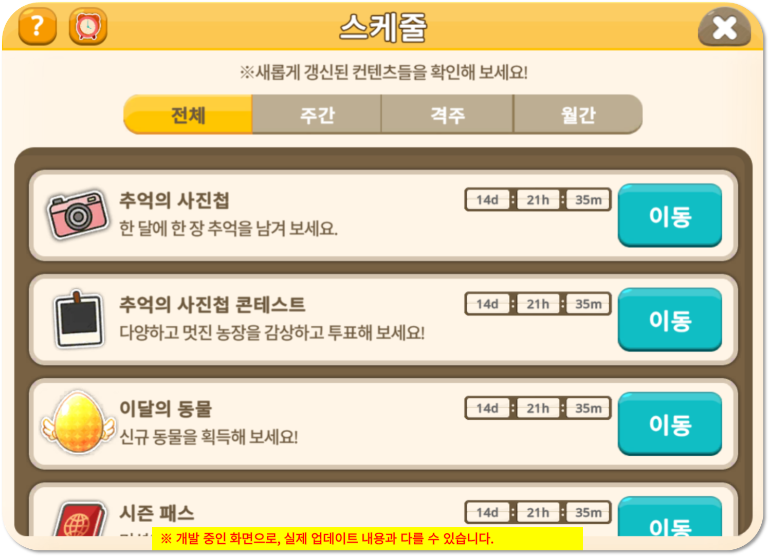 ◾ 동물 협회, 농민 협회, 추억의 사진첩 등 정기 콘텐츠의 스케줄 정보를 확인할 수 있는 기능이 추가됩니다.