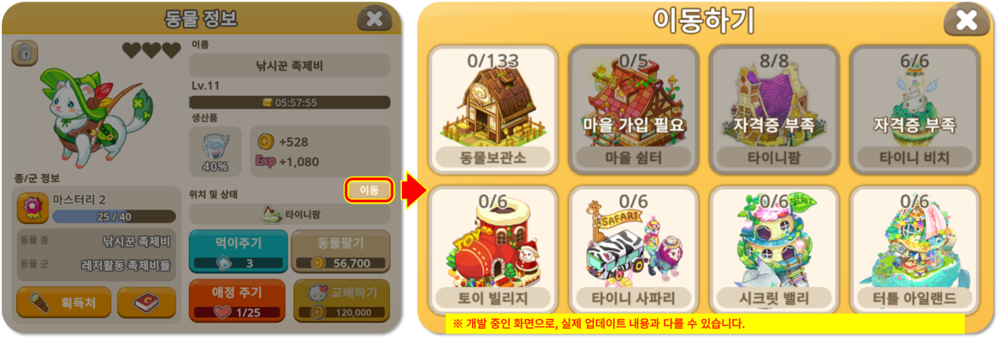 ◾ 동물 정보 팝업의 ‘보관’ 버튼이 ‘이동’ 버튼으로 변경되어, 해당 동물을 바로 보관소 또는 다른 지역으로 이동할 수 있습니다.