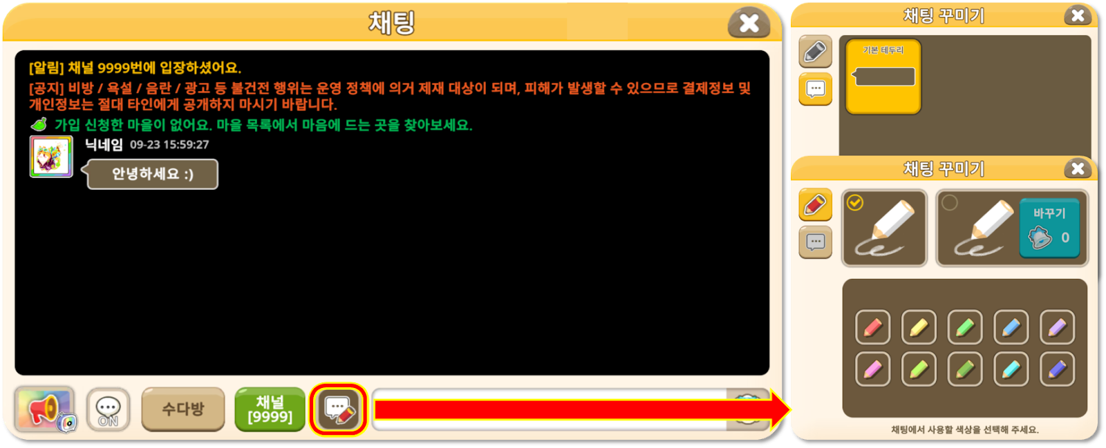 ◾ 채팅 화면에 ‘채팅 꾸미기’ 버튼이 추가됩니다. 채팅 꾸미기에서는 폰트 색상과 채팅 테두리를 설정할 수 있습니다.