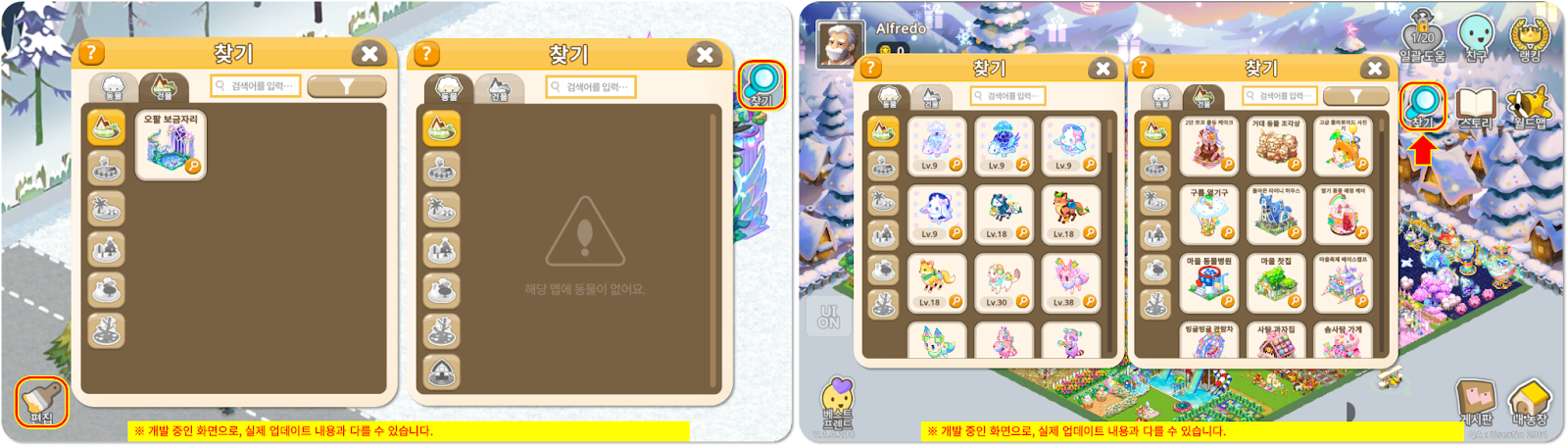 ◾편집 모드, 친구 농장에 ‘찾기’ 기능이 추가됩니다. 찾기 메뉴에서 배치된 동물, 설치물을 확인하거나 검색할 수 있습니다.