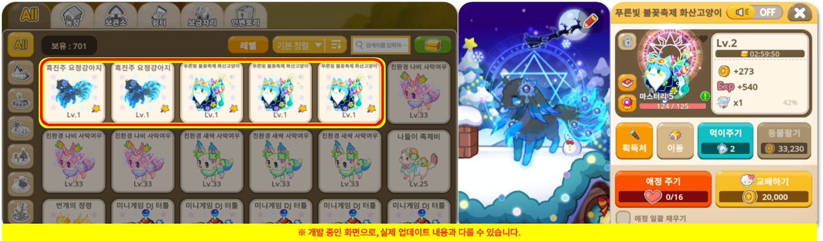 푸른빛 불꽃축제 화산고양이 교배를 통해 획득 가능 | 흑진주 요정강아지 교배를 통해 획득 가능 |