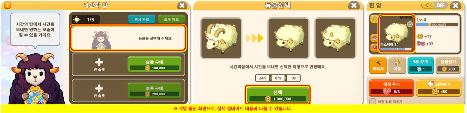 ◾시간의 탑에 동물을 보내 시간을 보내거나, 골드를 사용해 즉시 완료하여 동물의 외형을 변경할 수 있습니다.