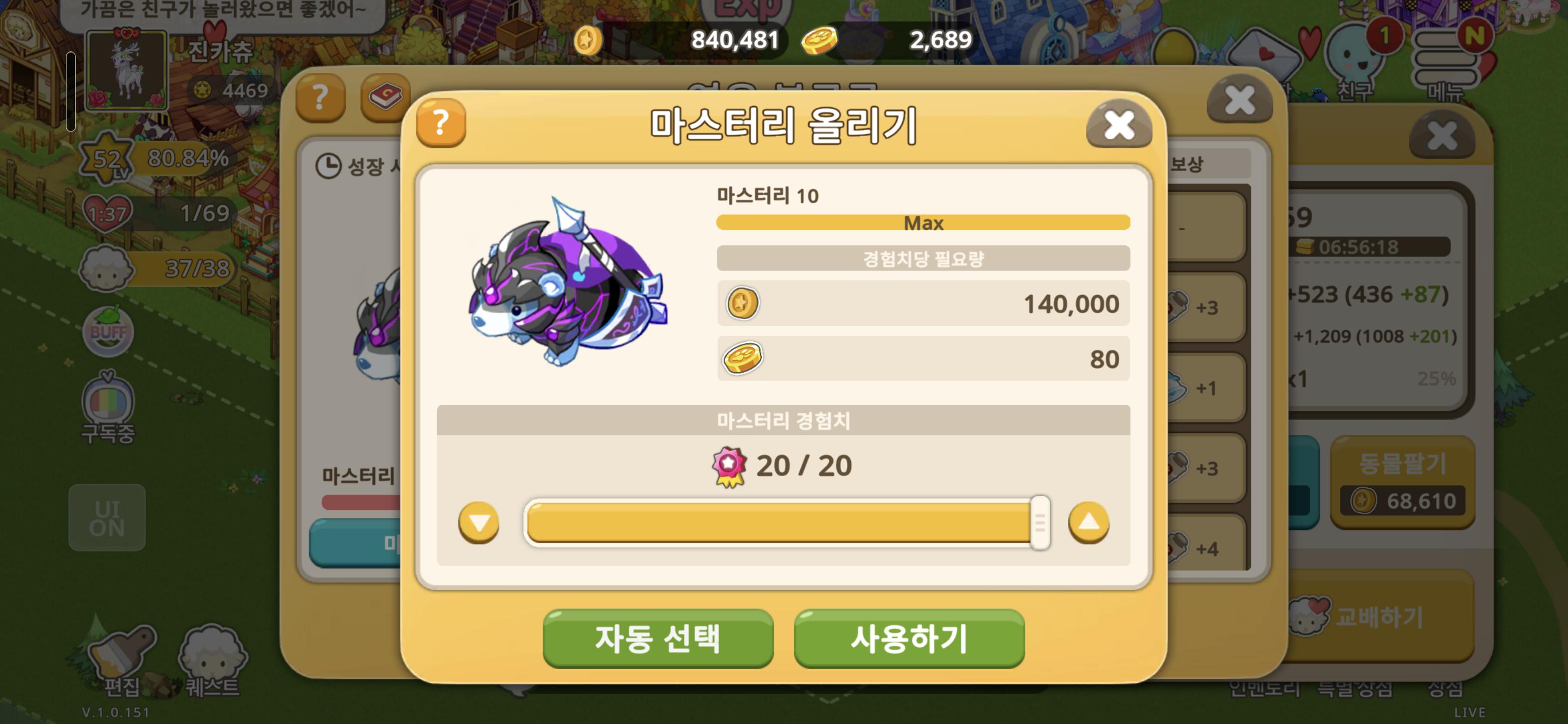 사용하기 클릭 후 선택한 동물의 마스터리를 올리시겠어요? → 네 선택