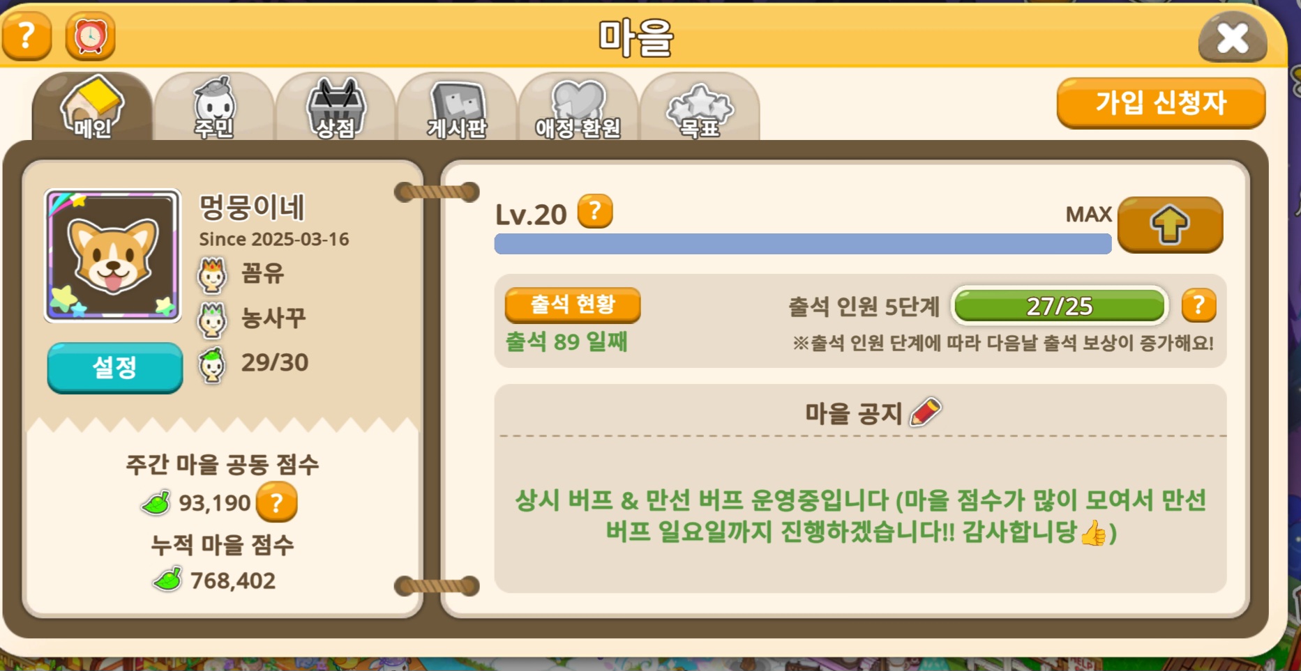 매일 출석, 주간 마을 점수 3000점 가능한 주민 모집합니다 :)