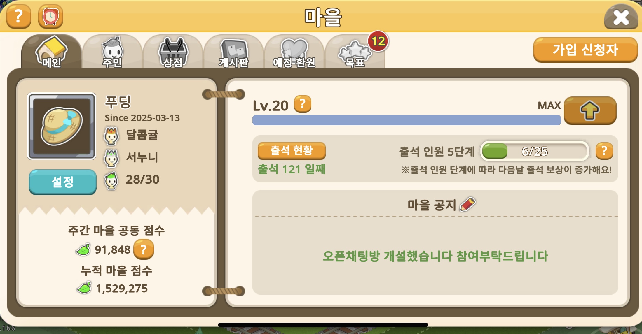 LV20 마을 🍮푸딩🍮 주민 두분 모십니다. 버프 상시 3종 가동