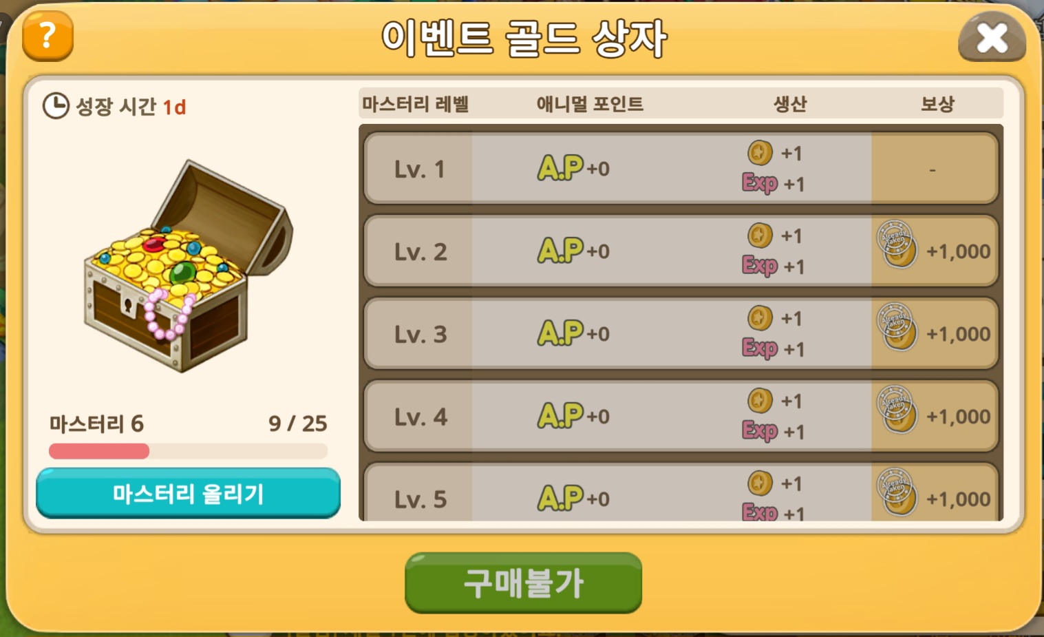동물 "이벤트 보물상자"의 마스터리를 올리는 데 필요한 재화가 마스터리 7미만의 구간에서 표기보다 더 많은 재화를 요구합니다.
