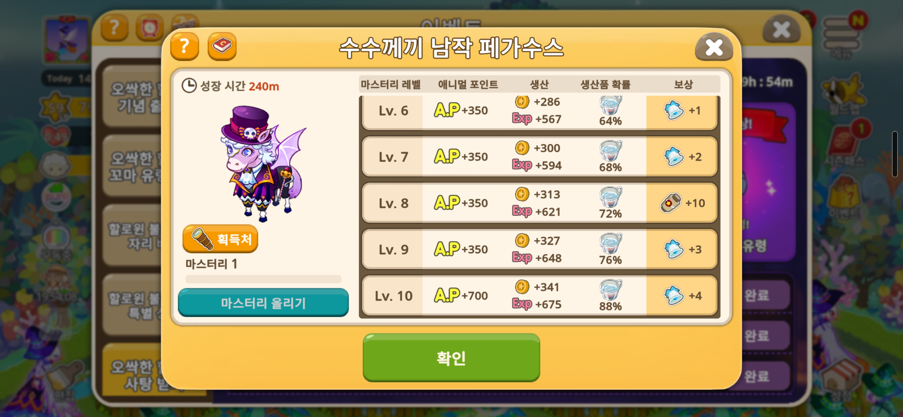 보통 180분짜리 전설동물의 생산하는경험치인데 생산시간은 240분이네요