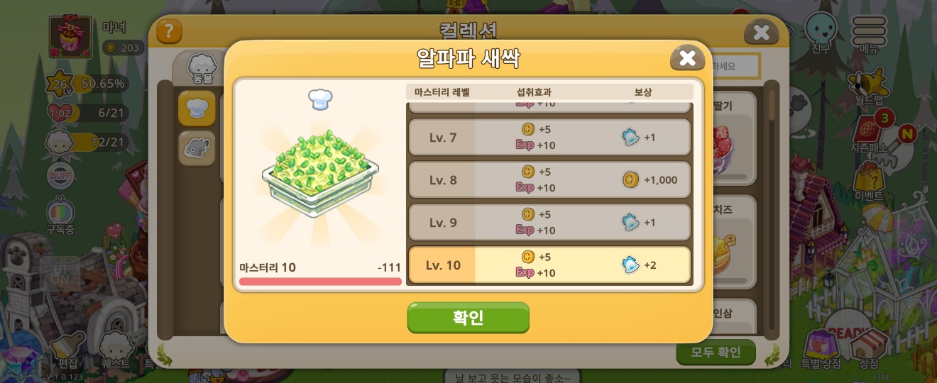 요리 컬렉션 '알파파 새싹' 마스터리 10 달성 했는데 7, 9, 10 보상인 벨이 안 들어와요...