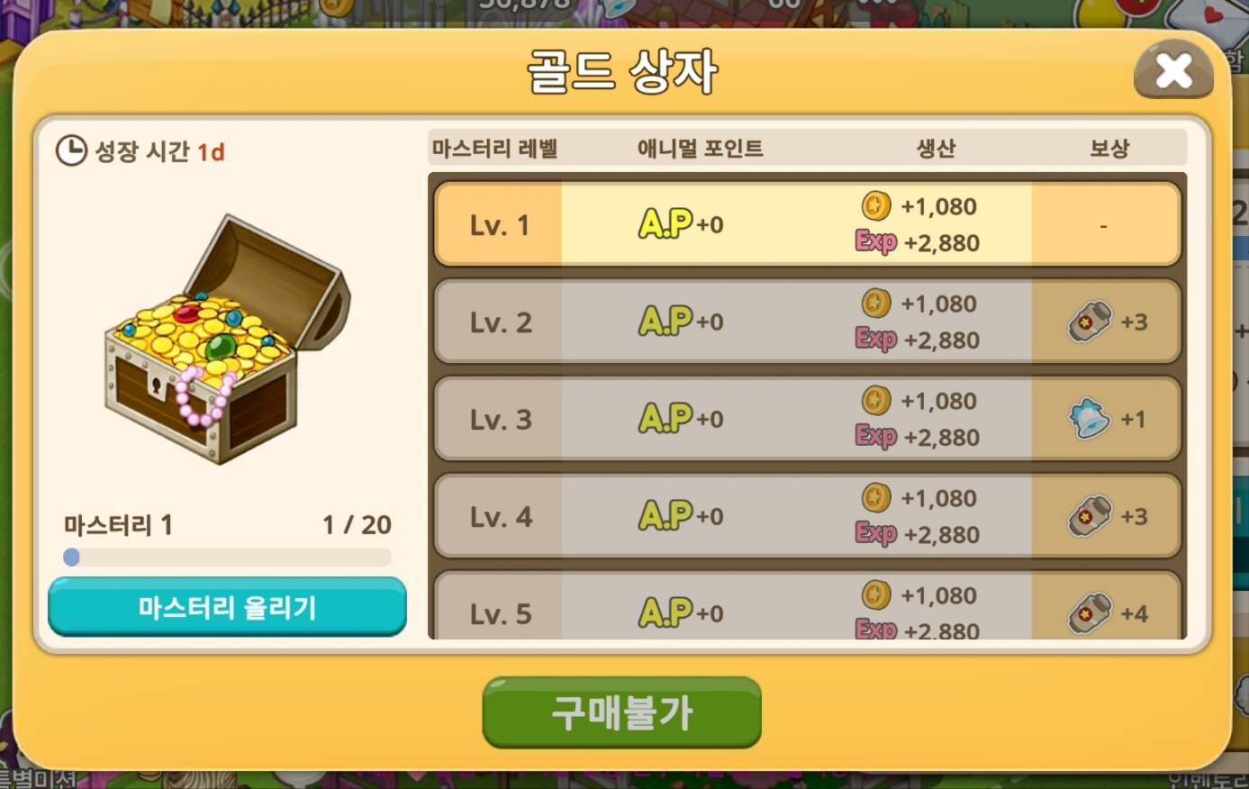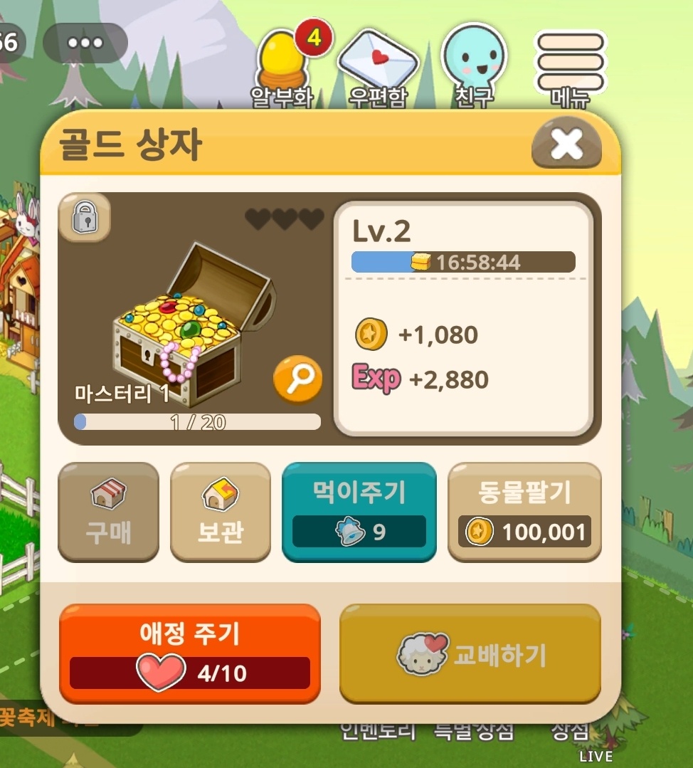 이벤트 골드상자말고 말하는 동물이나 영웅급들 교배하니 그냥 골드상자가 나오는데 이벤트와는 다르더라구요. 키워보는 중인데 마을에 애정환원하는 부분에서 이상한 문제점이 있어요. 애정환원 화면에 흰색으로 보이는게 골드상자입니다. 확인부탁드려요.
