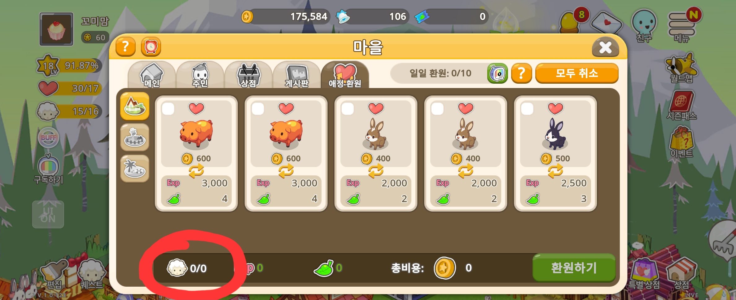 마을 애정환원을 한번도 안했는데 왜 동물선택이 안될까요?