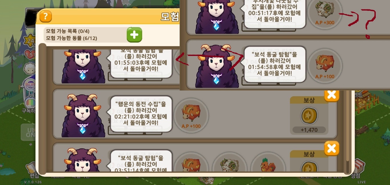사진을 보면 아래 세가지 “보석 동굴 탐험” “행운의 동전 수집” “보석 동굴 탐험” 을 아까 말한 것과 같이 ‘말하는 양’을 위주로 보냈는데요… 맨 위의 '영웅 양'은 '말하는 양'이 목록에서 나오지 않자 ‘내가 말하는 양 한마리를 보관소에 넣어놨나?’ 싶어 그냥 시간이 아까워서 돌렸습니다만…