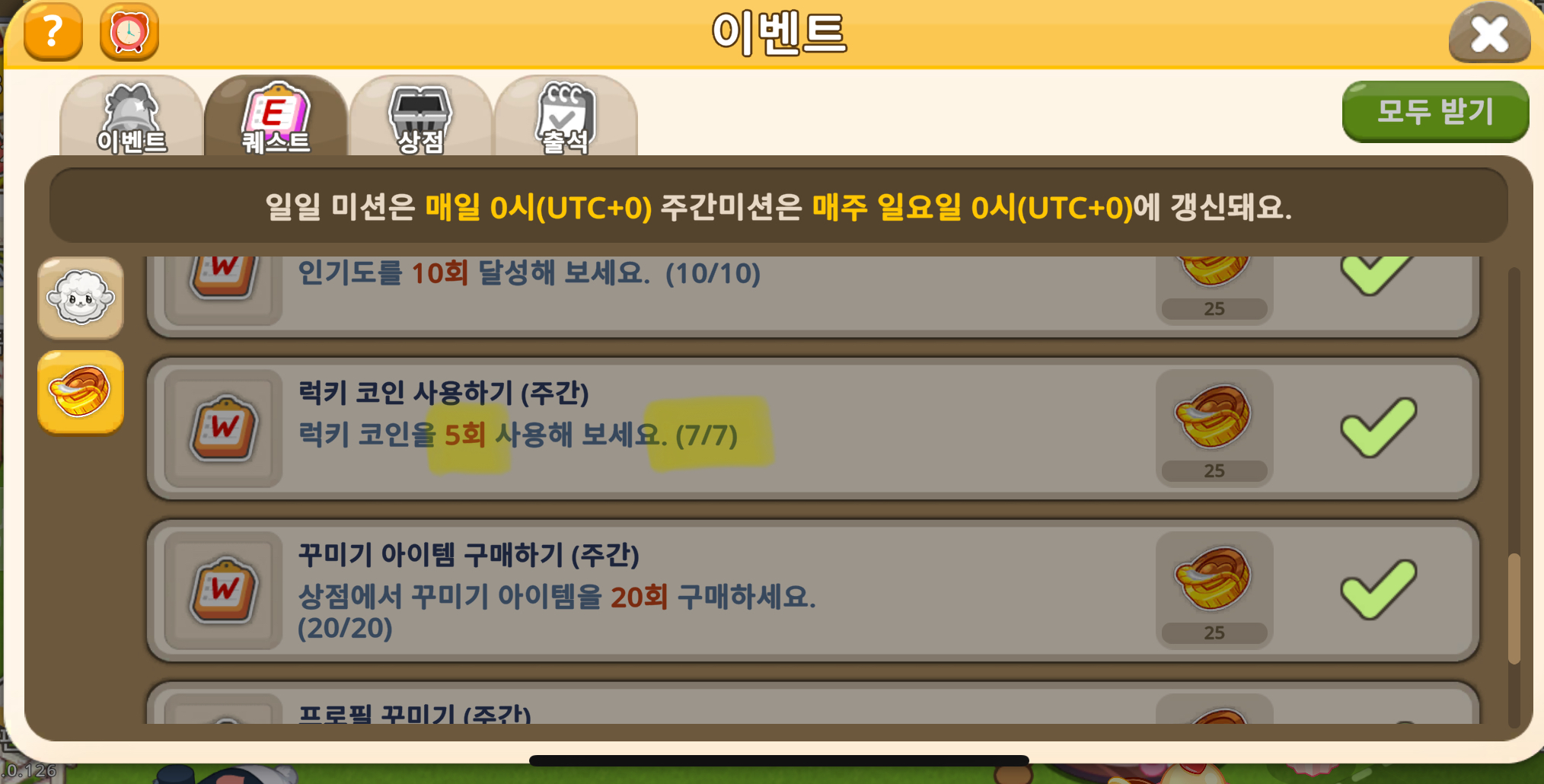 이벤트 주간퀘스트 - 럭키코인 5회라고 써놓고 카운트는 7회.