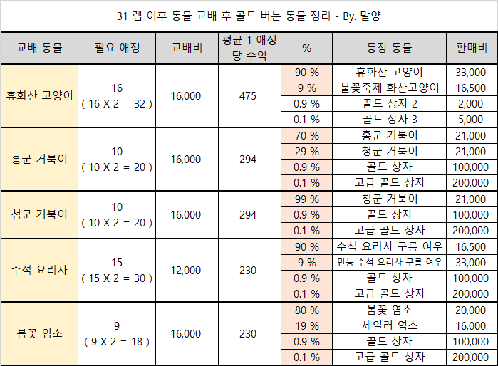 31렙 이후 교배로 통해 4,000 골드이상 남길 수 있는 동물 리스트 정리