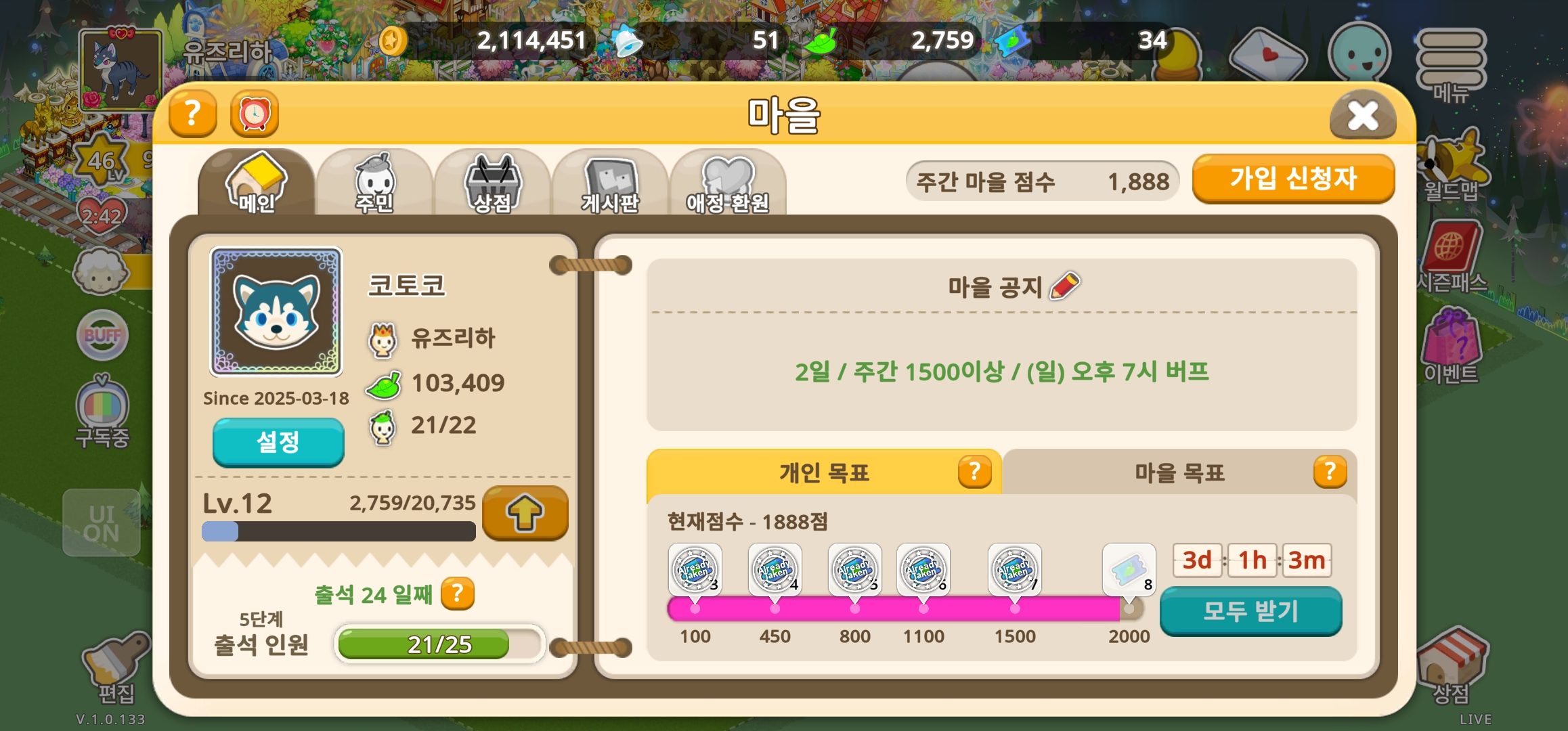🐺매주 일요일 오후 7시에 마을 요리버프 사용하고 있습니다!