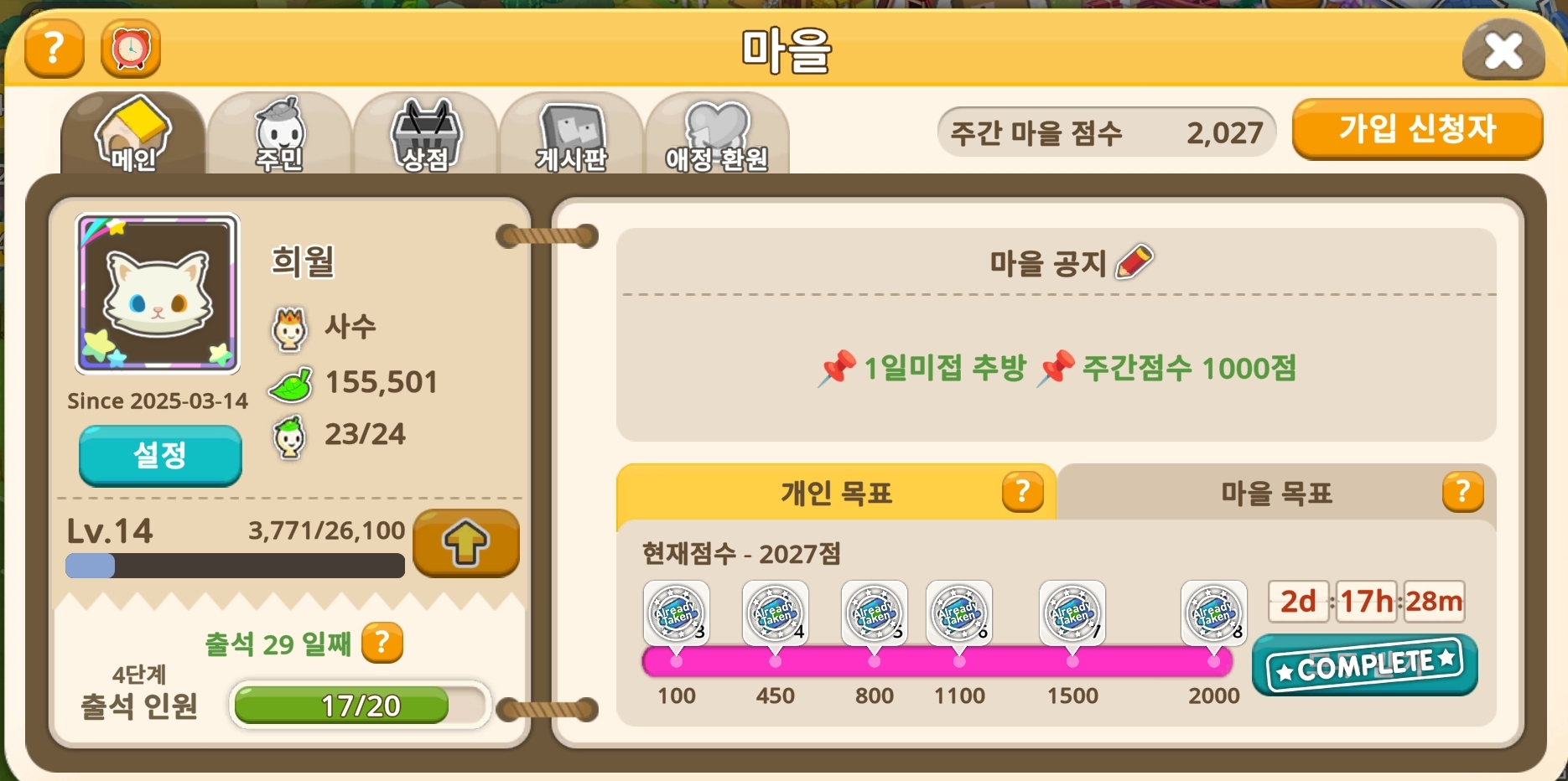 LV.14 [희월] 마을인원 모집해요 뉴비분들도 가능하니