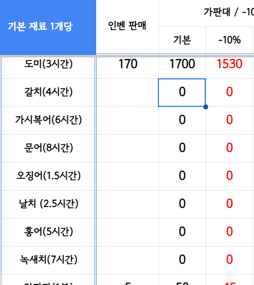 돌아다니고 있는 재료 계산 시트는 불편해서 직접 쓰려고 만들고 있는데,
