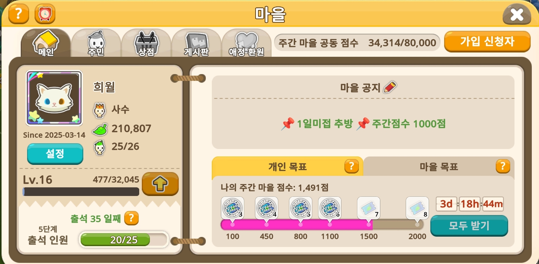 LV.16 [희월] 마을인원 모집해요 뉴비분들도 가능하니 접률 좋은분들만 인게임 들어 오셔서 가입신청 넣어주세요
