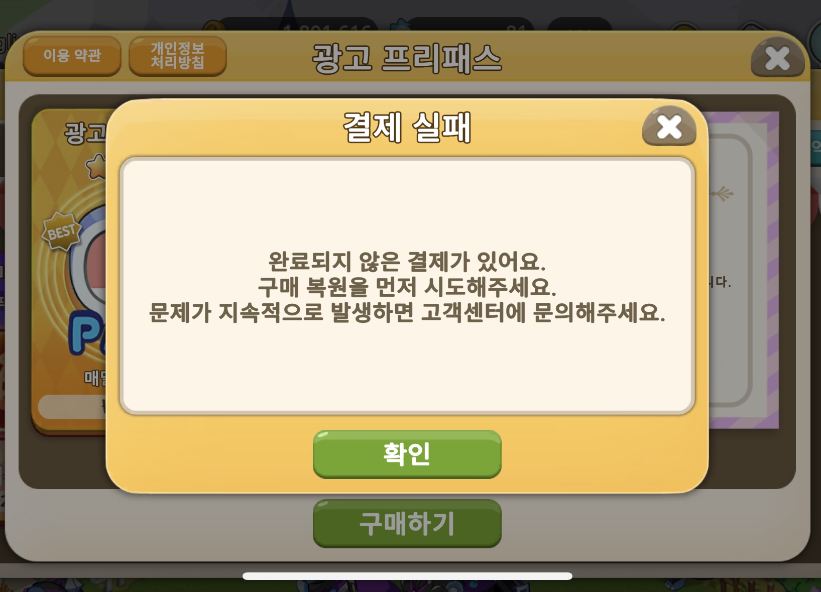 A계정에서 광고제거팩 사용중인데 B계정에선 이미 다른계정이 쓰고있어서 구매 안된다네요