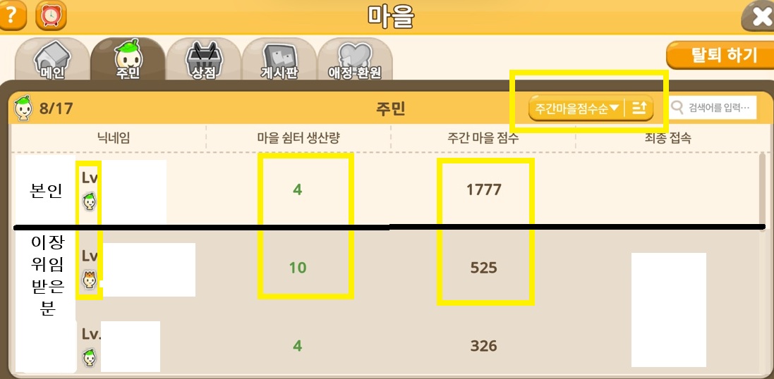 주민중에 3일 접속 기간중 점수가 제일 높은사람으로 변경되는거 아니였나요???