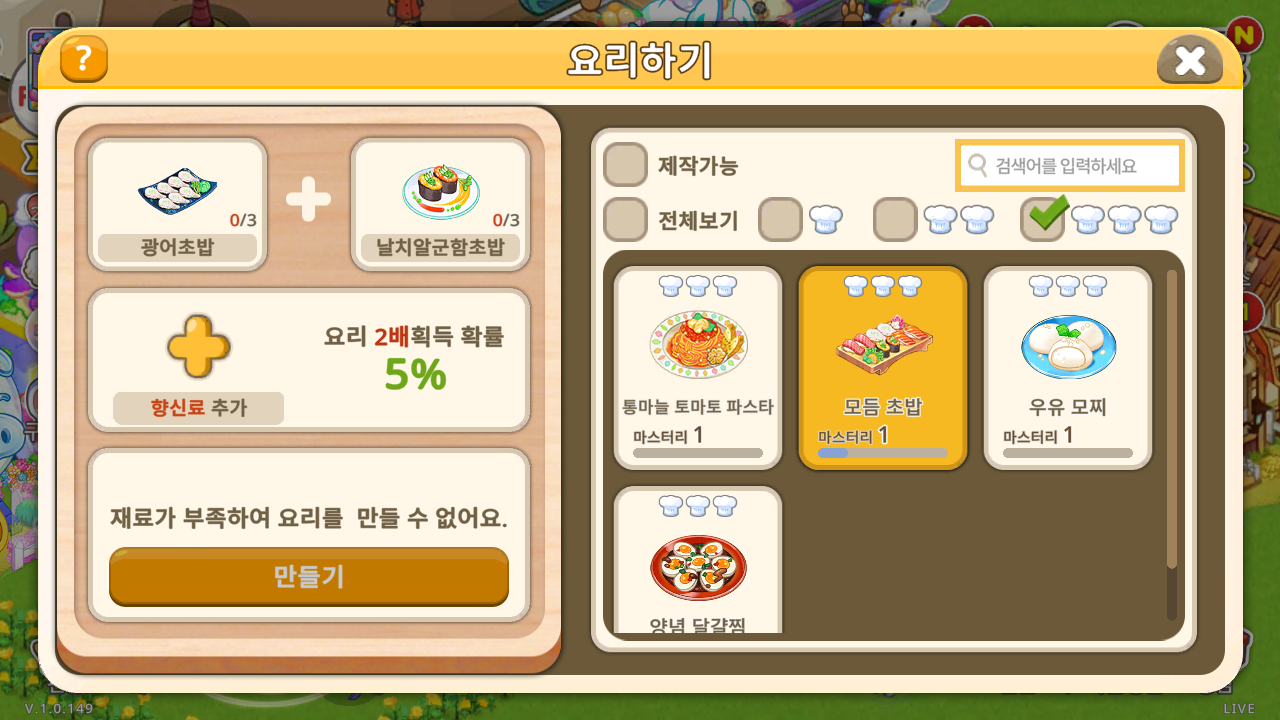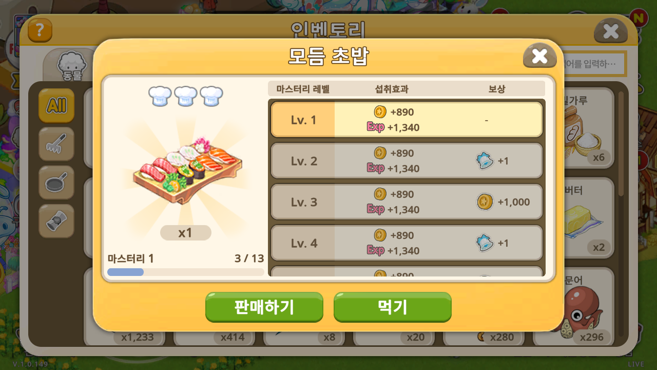 모듬 초밥은 890 골드 / 1340 경험치 라는