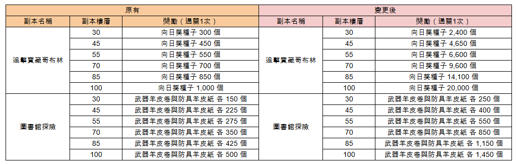 3. 地城通關時可獲得的武器羊皮卷、防具羊皮紙與向日葵種子的數量將提升。