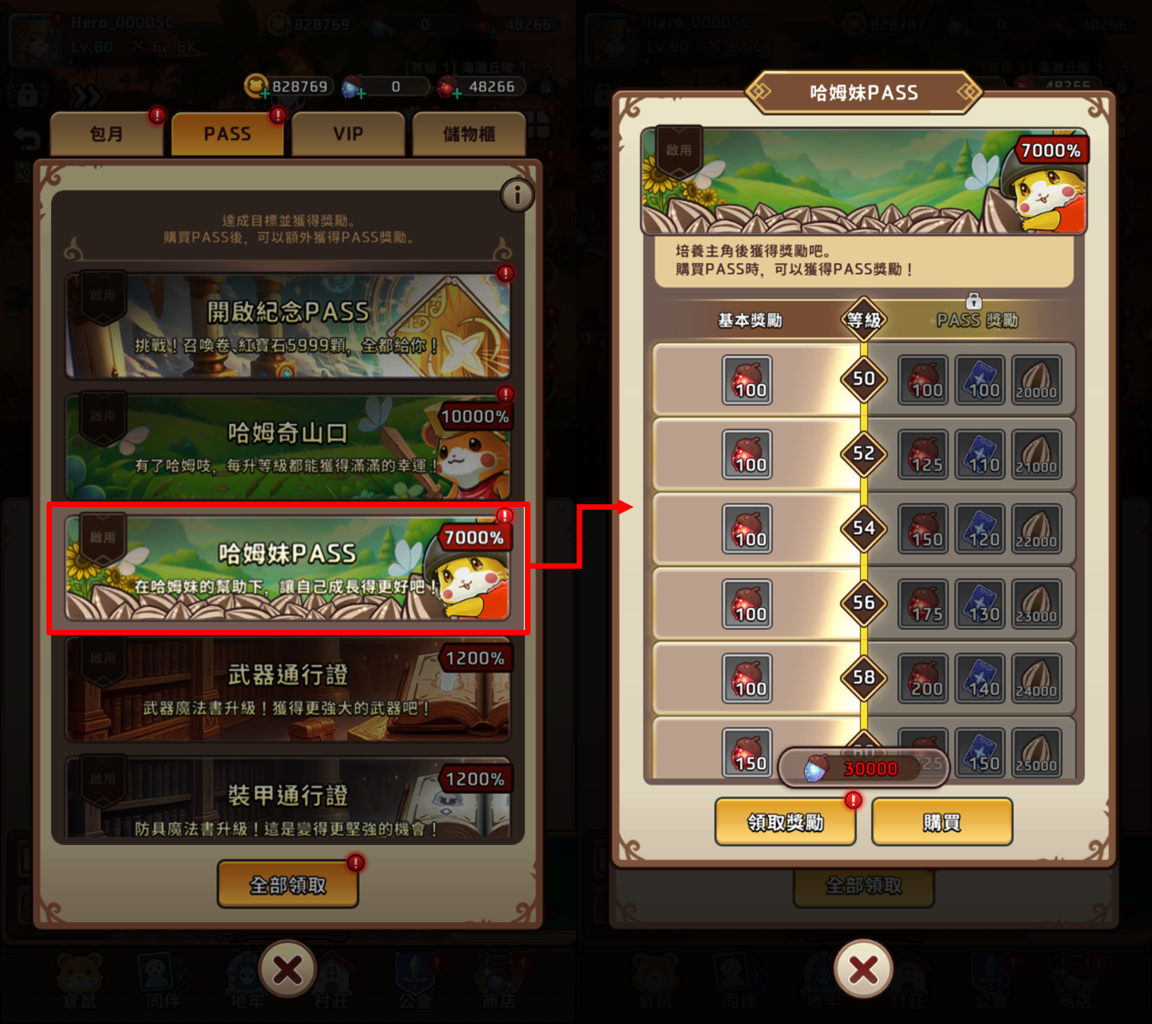 2) 提升哈姆鼠角色的等級後,可獲得紅寶石橡實、向日葵種子及英雄召喚券。