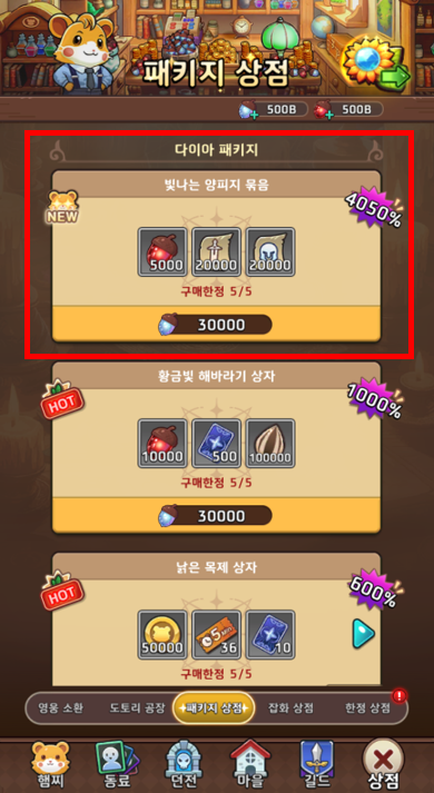 1) 패키지 상점 > 다이아 패키지 > 빛나는 양피지 묶음 상품이 추가됩니다.