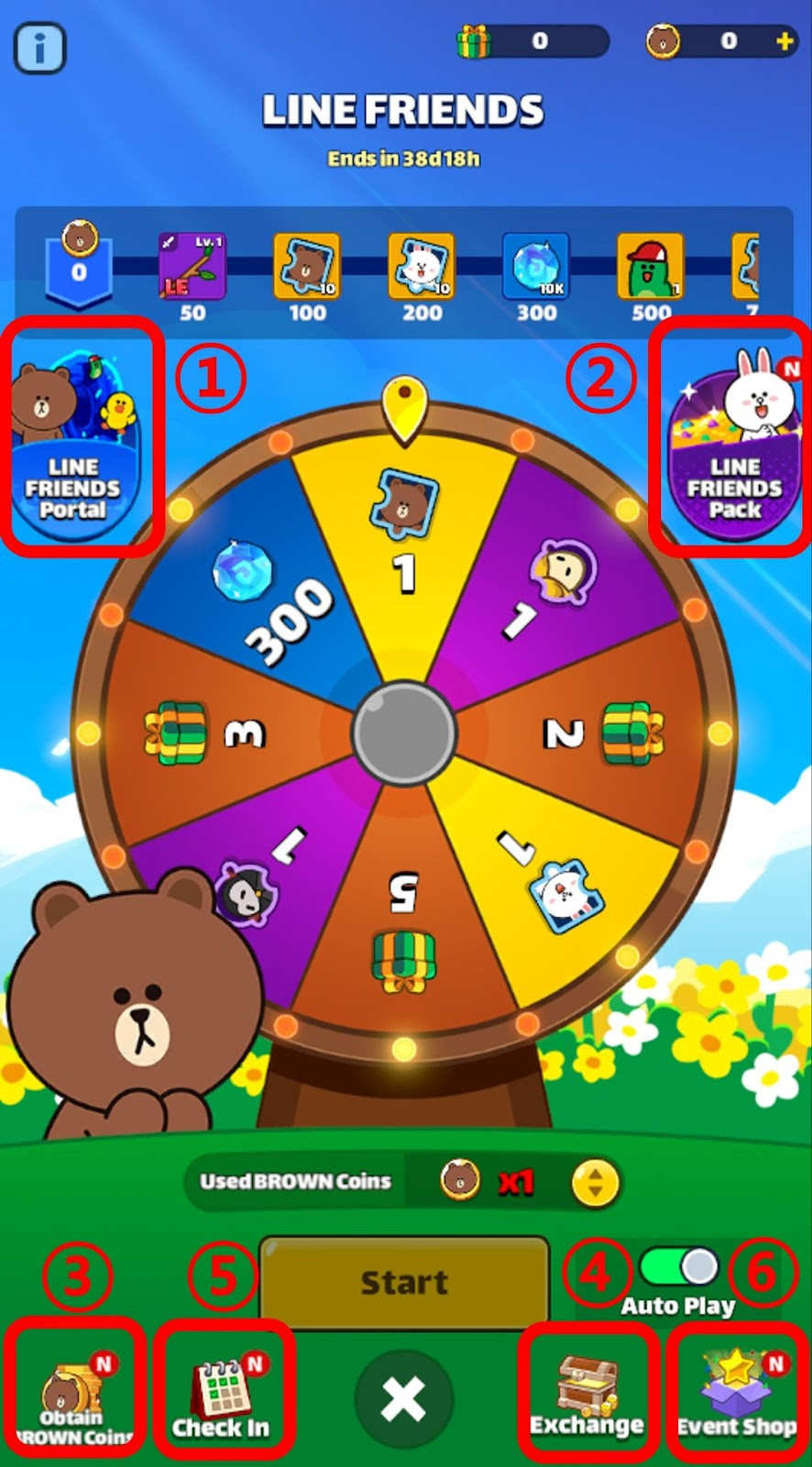 - Complete quests to earn BROWN Coins used in the LINE FRIENDS Event, a wheel-based minigame.