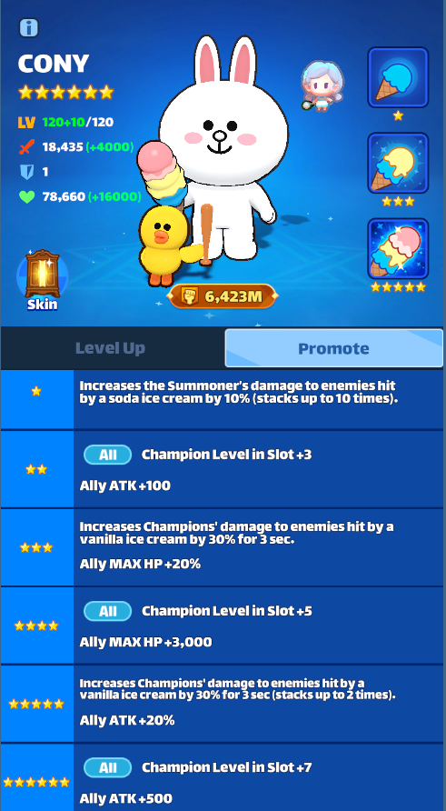 As for CONY, she has a skill that generates vanilla ice cream at a set rate, which make Champions attack stronger. Her passive effect increases the level of Champions.