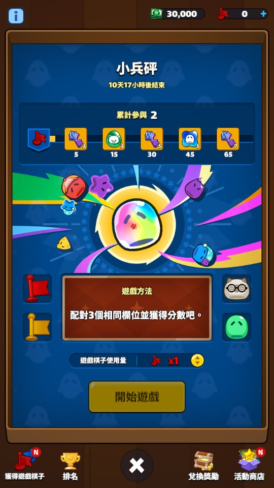- 「小兵砰」活動是在60秒的限制時間內,配對3個以上相同的小兵欄位將其消除並獲得分數的活動。