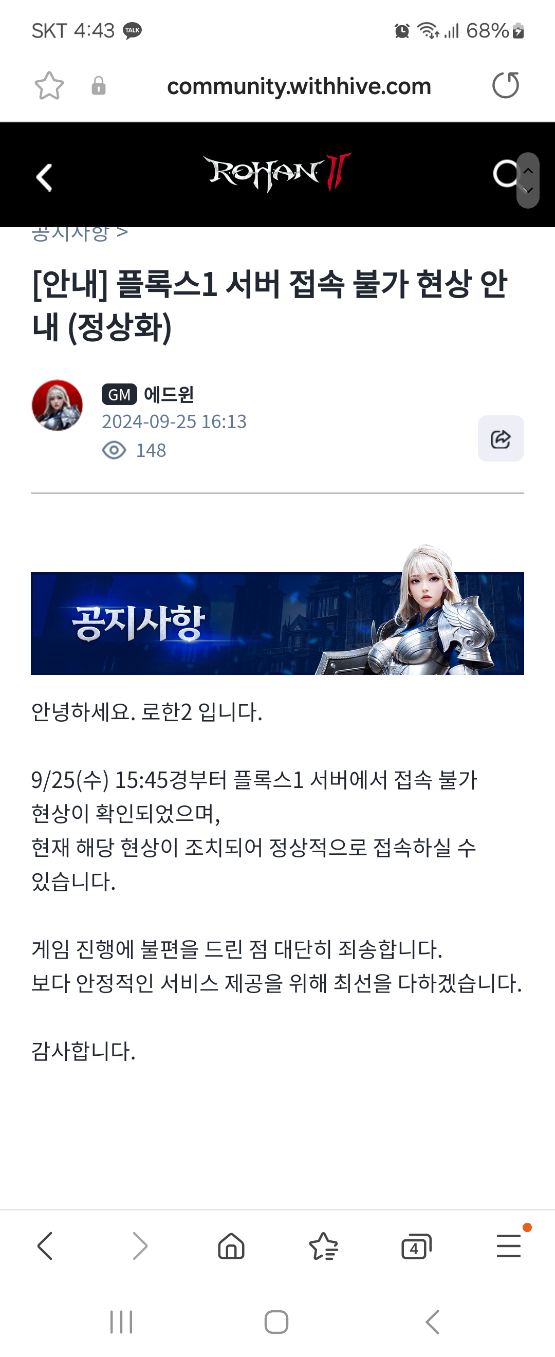 15:45분부터 접속 불가현상 발견...? 새벽6시부터 안되서 글올리고 1대1 문의넣엇는디