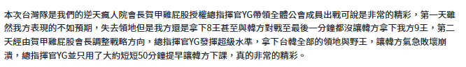 이번 대만 팀은 우리 「逆天瘋人院」 길드의 길드장 ‘賀甲雞屁股’이(가) 총지휘관 YG에게 권한을 맡겨 길드 전원이 출전한 경기였는데, 정말 엄청나게 멋졌습니다.