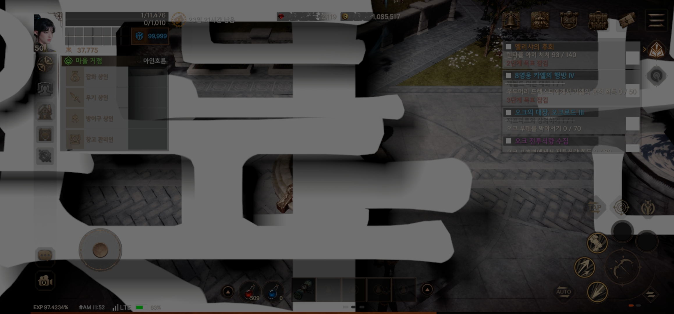 아래사진은 모바일 재 리셋 후 로그인시 마을멈춤현상