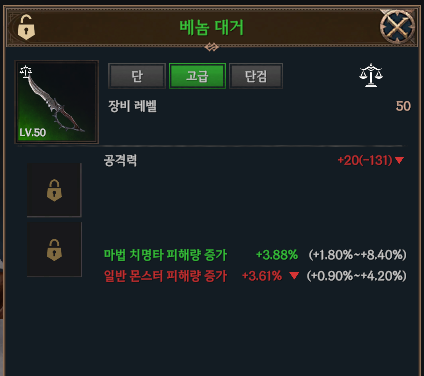 일반 무기 마법치명피해량 상옵(빨강)+일반피해 상옵(빨강) 옵션 무기 2개를 조합해서 만든 고급 대거임