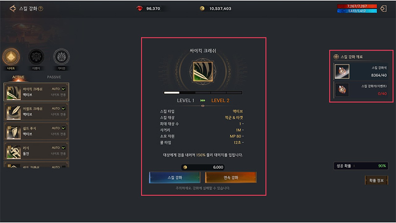 편의성 개선 패치도 함께 진행했습니다. 목표는 가시성으로 풀이되죠. 화면 구성과 그래픽 관련 패치가 많은 비중을 차지했거든요. 먼저 스킬 강화/승급 부문은 화면 구성을 개선했습니다. 변경 사항과 재료 보유량을 보기 쉽게 바꿨죠. 부여 옵션은 등급에 맞는 색상으로 표기하고요.