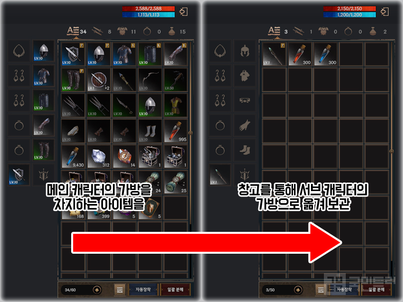 로한2는 장비를 합성해 상위 등급으로 만든다. 이때 합성 재료의 옵션 중 원하는 걸 조립하는 구조다. 장비는 '업데이트 후 한 번에 합성해야지' 보다 '미리 합성해서 옵션을 정리'로 하자. 가방 공간과 추후 합성 시간을 아끼기 위해서다. 가방 관리가 어렵다면 창고와 서브 캐릭터를 이용하는 것도 좋은 방법이다. 창고를 통해 같은 서버 캐릭터에게 아이템을 보낼 수 있다. 서브 캐릭터를 창고로 사용하는 것이다.