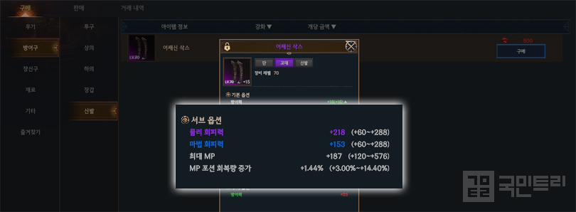 ▲ 신발과의 회피 스탯은 무척 고평가 받는 조합이다 (사진: 국민트리 제작)