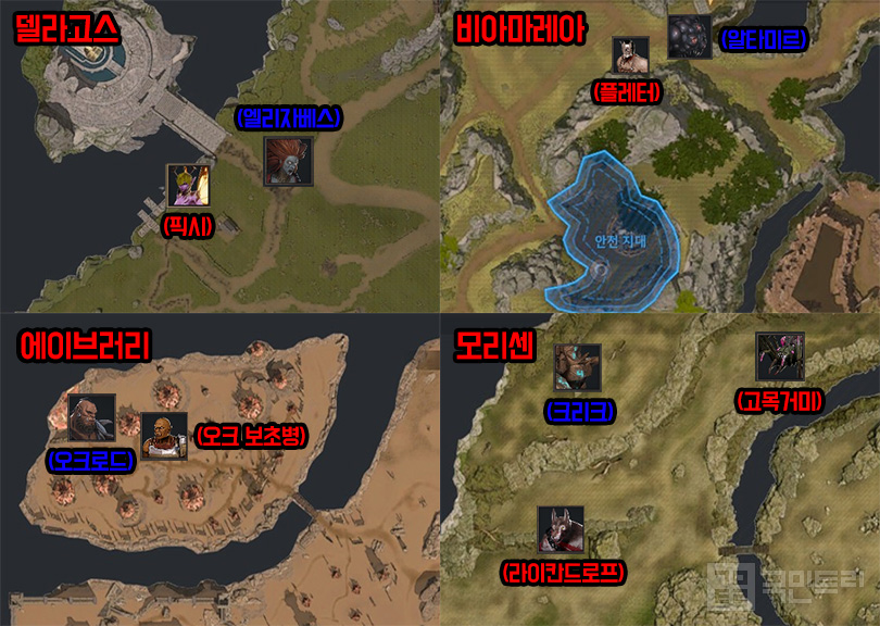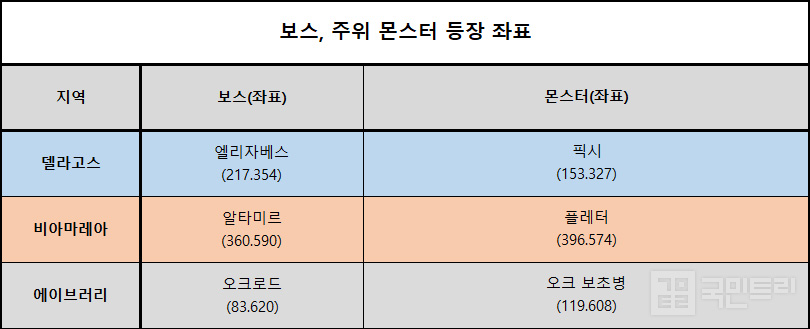 ▲ 각 지역별 보스 및 몬스터 위치 좌표 (자료: 국민트리 제작)