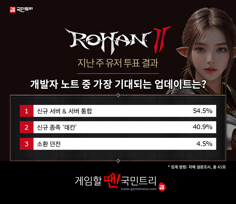 지난주 ‘개발자 노트 중 가장 기대되는 업데이트는?’을 주제로 투표를 진행했습니다. 가장 많은 표를 받은 사항은 ‘신규 서버 & 서버 통합’이었습니다. 뒤를 이어 ‘신규 종족 데칸’이 40.9%로 2위, ‘소환 던전’이 4.5%로 3위를 차지했습니다.