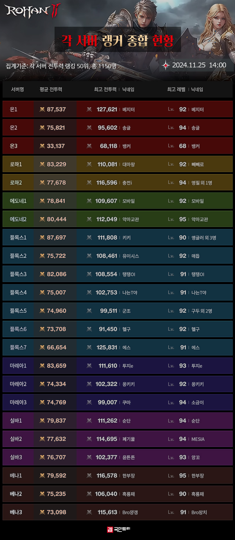 ▲ 로한2 11월 4주차 각 서버 랭커 현황 (자료: 국민트리 제작)