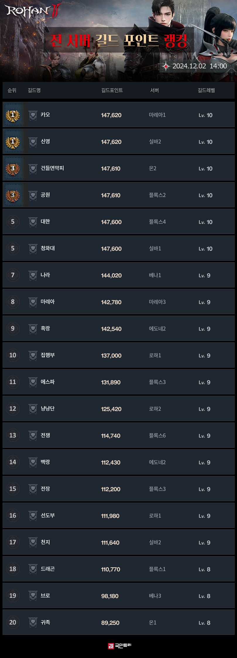 전 서버 길드 포인트 순위는 공동 순위가 여럿 등장했습니다. 1위는 마레아1 서버 ‘카오’와 실바2 서버 ‘신명’ 길드가 공동으로 차지했습니다. 14만 7,620 포인트를 모았죠. 뒤를 이어 온2 서버 ‘건들면막피’와 플록스2 ‘공원’ 길드가 14만 7,610 포인트를 기록했습니다. 뒤이어 5위도 두 길드가 동점으로 나란히 이름을 올렸죠. 플록스4 ‘대한’과 실바1 ‘청와대’가 길드 포인트 14만 7,600을 모았습니다.