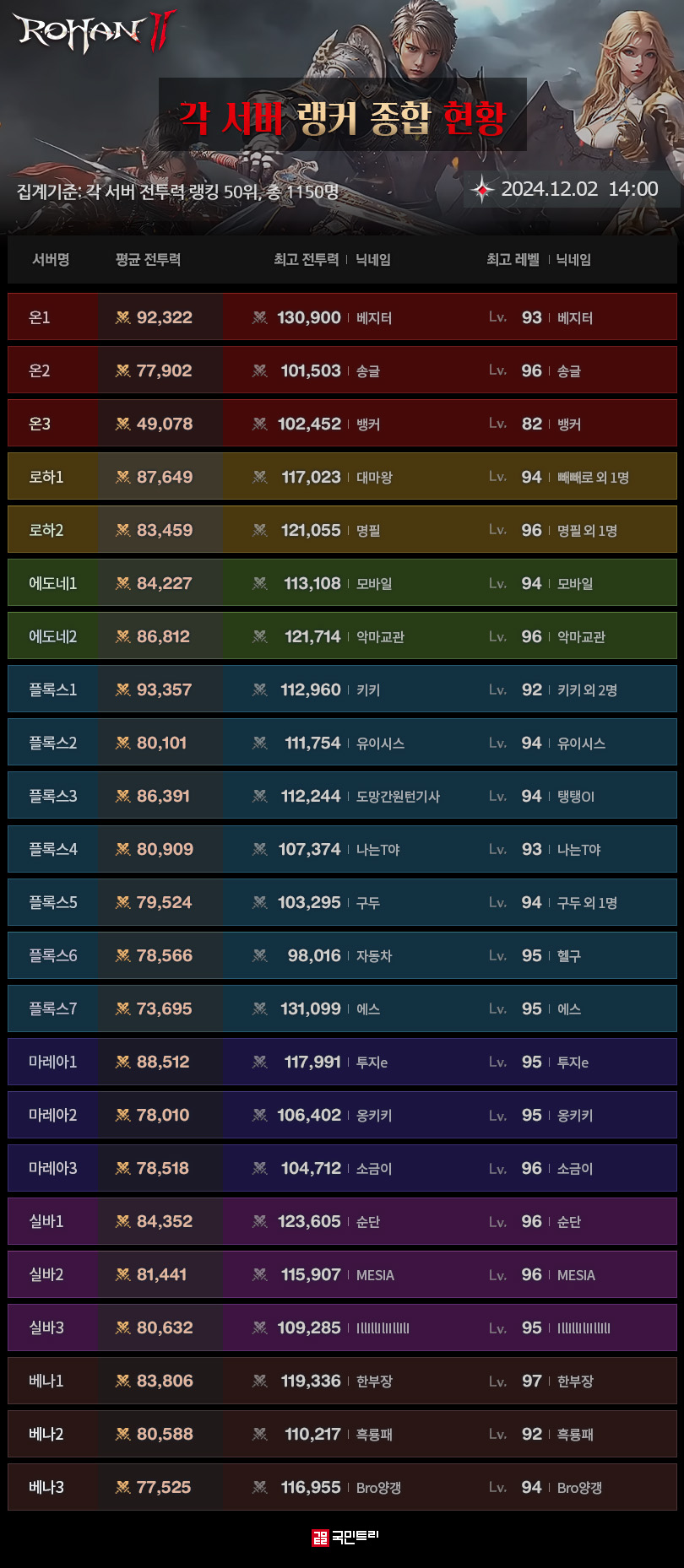 ▲ 로한2 12월 1주차 각 서버 랭커 현황 (자료: 국민트리 제작)