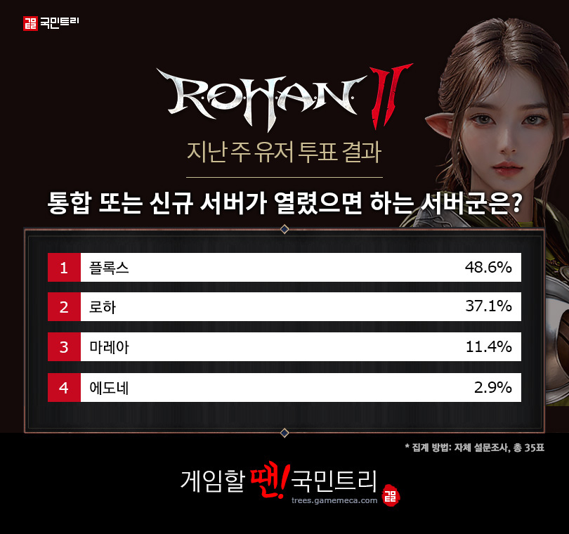 지난주 ‘통합 또는 신규 서버가 열렸으면 하는 서버군은?’을 주제로 투표를 진행했습니다. 가장 많은 표를 받은 서버군은 ‘플록스’였습니다. 무려 7개 서버가 있어 통합을 원하는 유저, 혹은 신규 서버를 원하는 유저가 많았던 것 같네요. 뒤를 이어 ‘로하’가 37.1%로 2위였고, 마레아와 에도네도 약간의 표를 받았습니다.