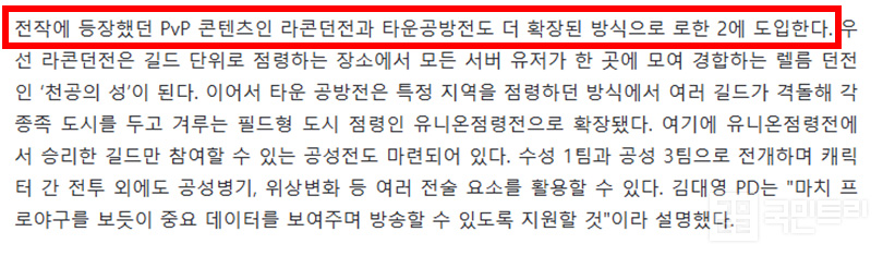 사실 로한2는 23년 11월 18일 인터뷰에서 타운공방전 정보를 살짝 공개한 바 있다. 앞서 소개한 원작과 규칙이 다르다. 특정 지역을 점령하는 게 아닌 여러 길드가 격돌해 각 종족의 도시를 두고 겨루는 필드형 도시 점령 '유니온 점령전'으로 확장한다 밝혔다. 그리고 유니온 점령전에서 승리한 길드만 참여 가능한 '수성 1팀, 공성 3팀'의 공성전을 개최해 공성병기, 위상변화 등 여러 전술 요소를 활용할 수 있게 만든다고 했다. 원작의 길드 간 1대1에서 더 확장된 전투를 준비 중인 셈이다.