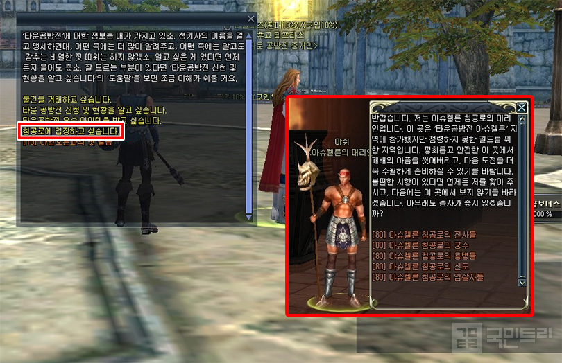 타운공방전 패자를 위한 보상도 있다. 바로 침공로 던전이다. 설정상 오래전 타운공방전을 차지하기 위해 수련을 쌓는 장소다. 승리하지 못한 길드의 캐릭터만 입장할 수 있는 안전 사냥터라 할 수 있다. 다음 타운공방전 대기 기간까지 이용하고, 침공로에서만 등장하는 몬스터 사냥과 전용 퀘스트를 진행 가능하다. 패배한 길드원들의 레벨업을 보조하며 다시 한번 기회를 주는 셈이다.