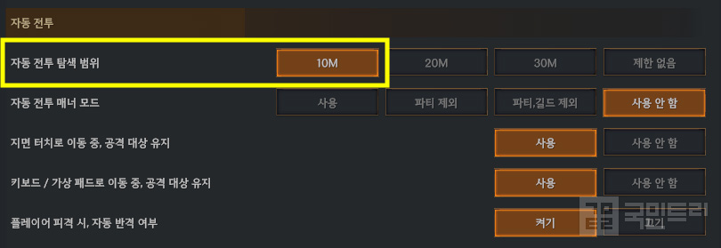 ▲ 자동 전투 탐색 설정 거리를 최대한 짧게 (사진: 국민트리 촬영)