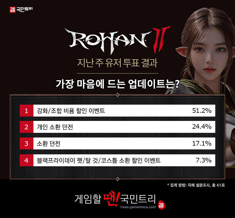 지난주 ‘가장 마음에 드는 업데이트는?’을 주제로 투표를 진행했습니다. 가장 많은 표를 받은 업데이트 요소는 ‘강화/조합 비용 할인 이벤트’였습니다. 무려 51.2%의 표를 받았죠. 아무래도 장비 스펙업에 드는 크론을 크게 아낄 수 있는 기회라 선호하는 유저가 많았던 것 같군요. 뒤를 이어 ‘개인 소환 던전’, ‘소환 던전’ 등이 표를 받았습니다.